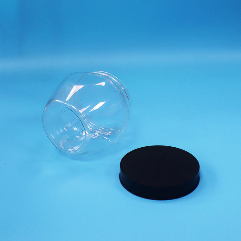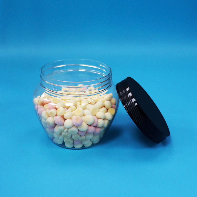 Sellado transparente de forma única de plástico de PET dulces de comida jar de galletas negro tapa de plástico