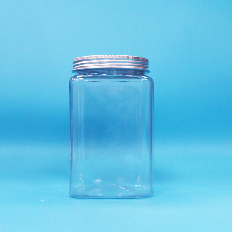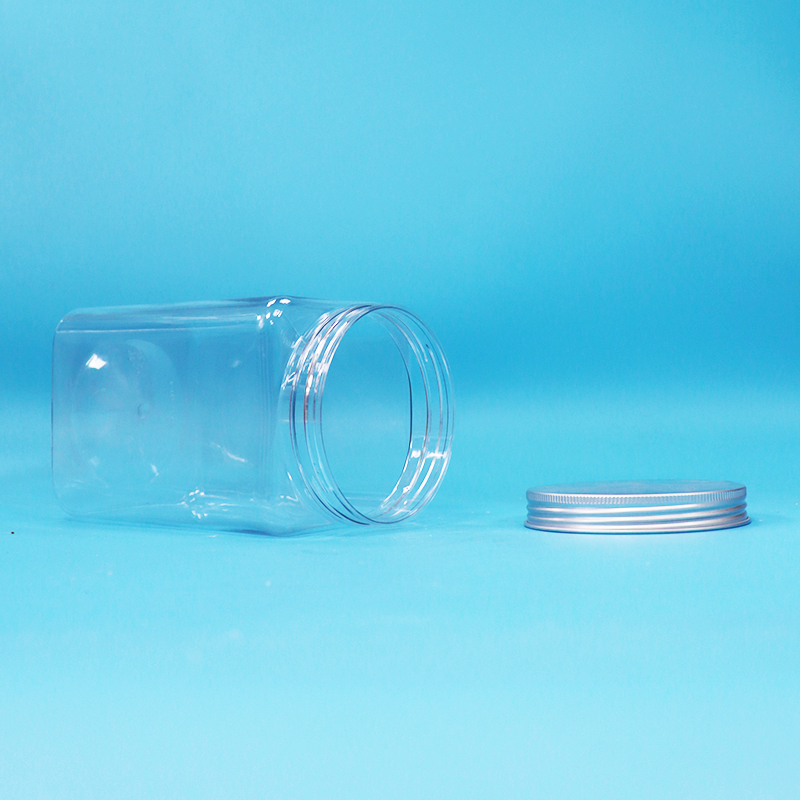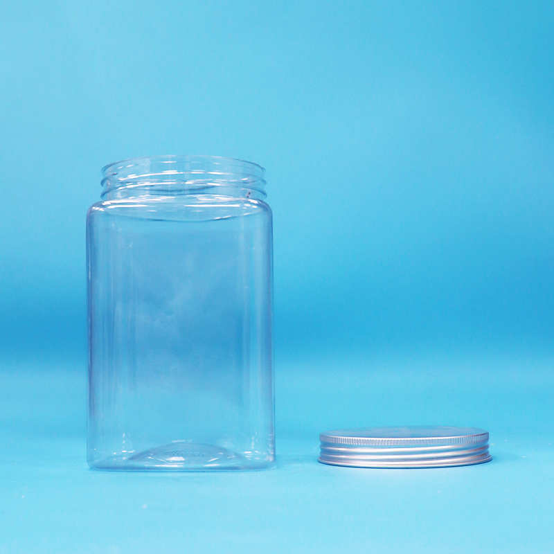 Tarro de plástico PET transparente cuadrado sin BPA para fideos y caramelos con tapa de aluminio roscada